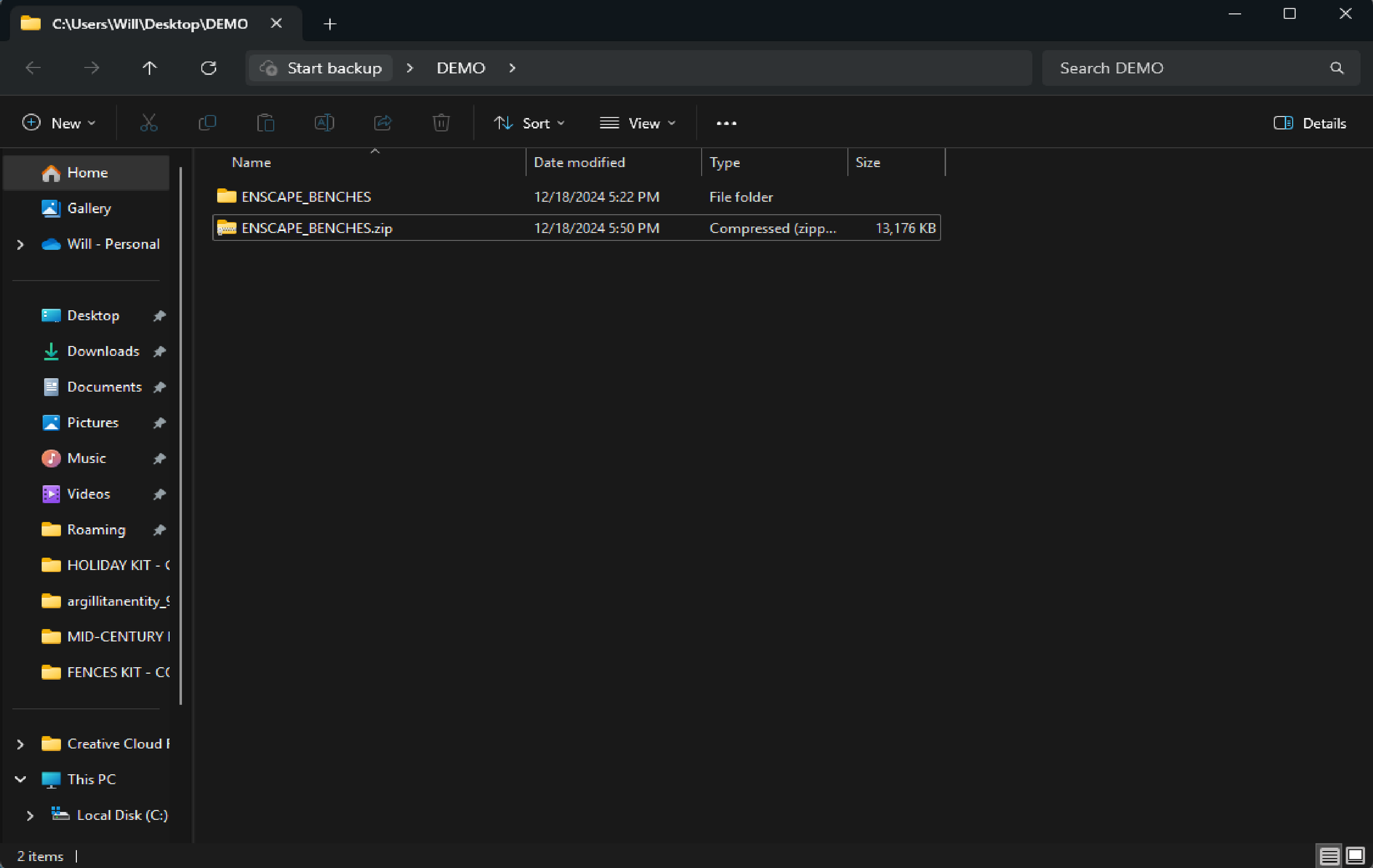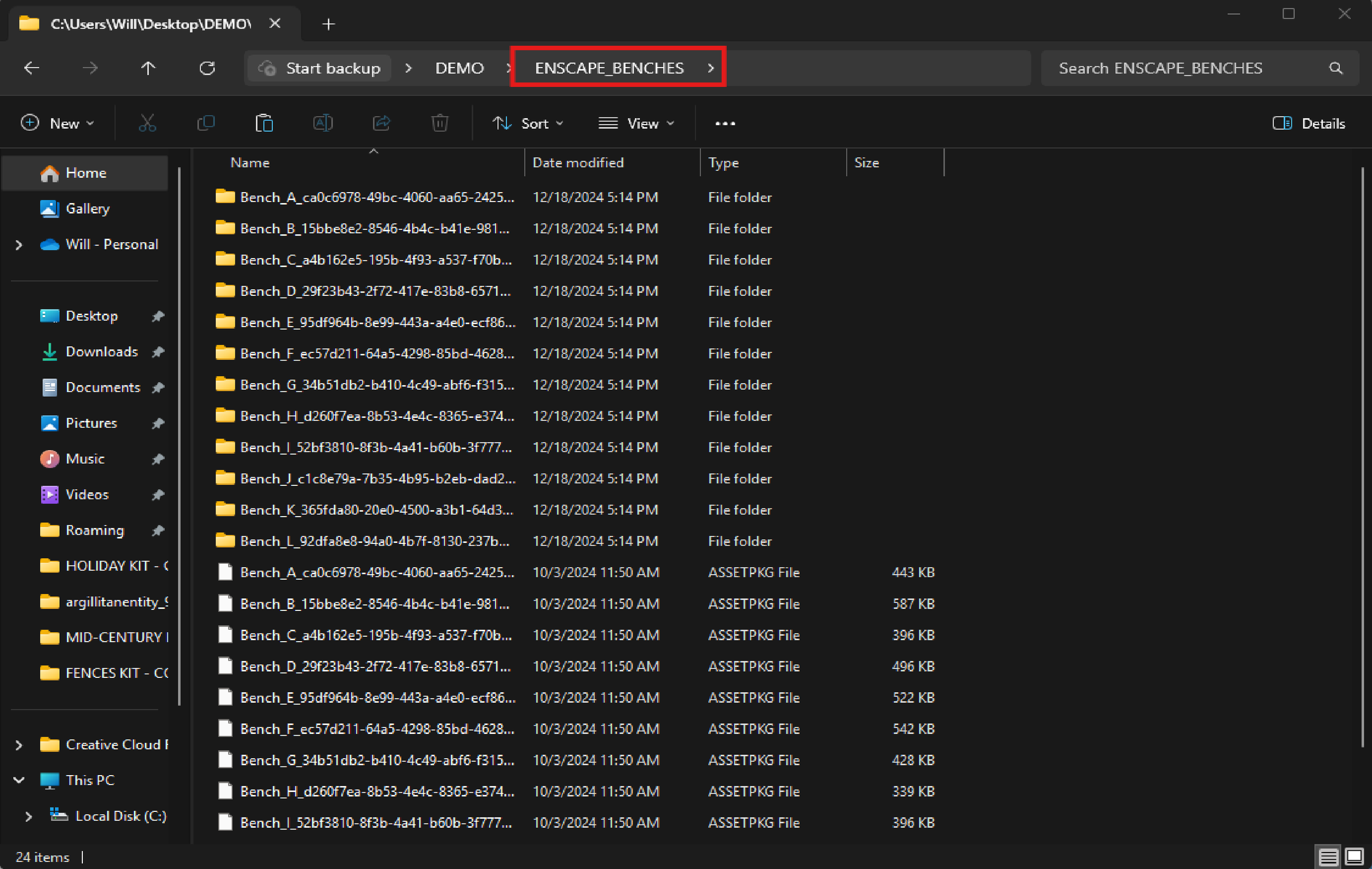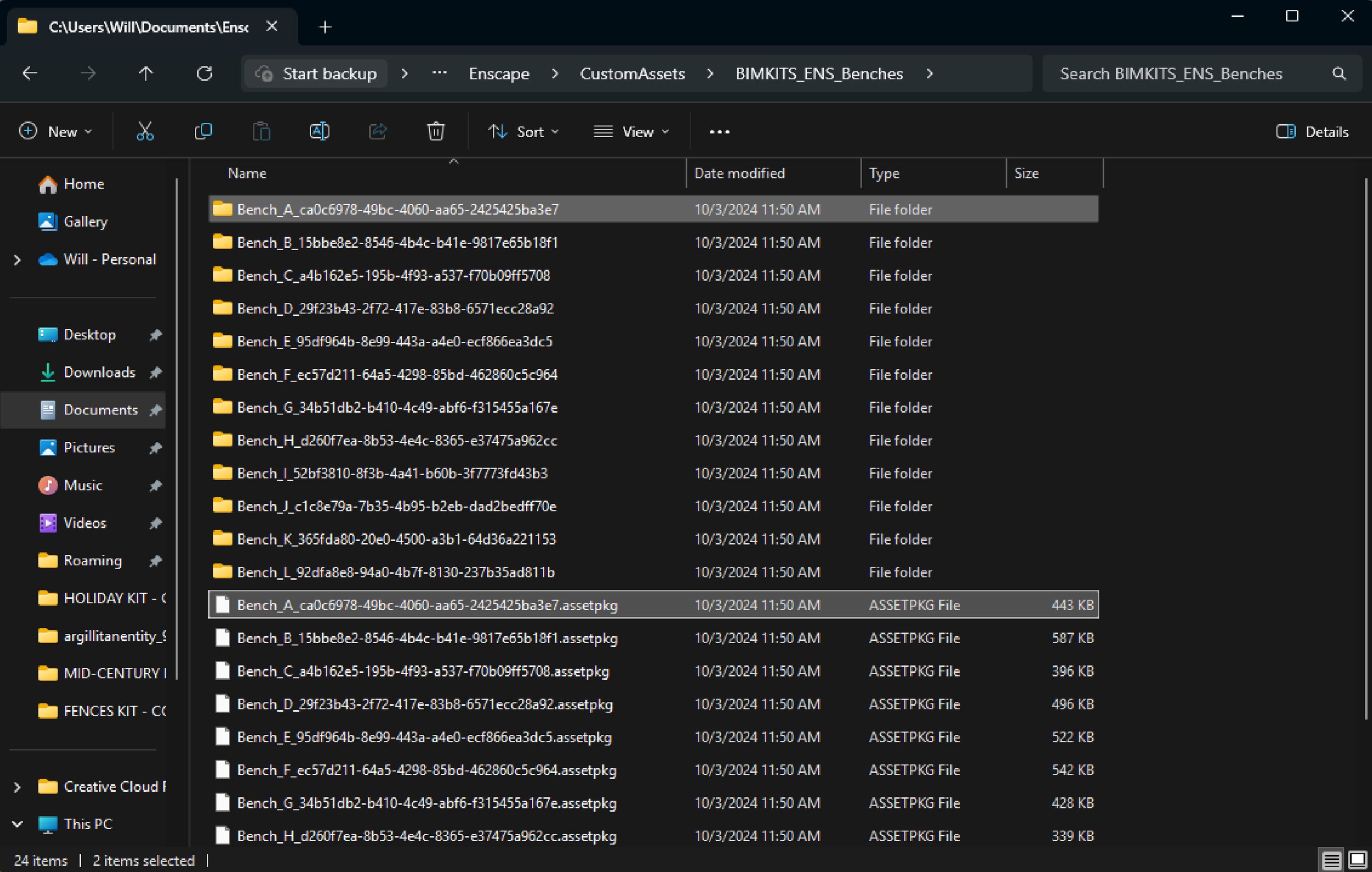 Create a new folder on your desktop or wherever you want to stage things and give it a clear name, something like ENSCAPE_BENCHES so the recipient knows what they’re getting. Then go into your Custom Asset folder and grab the matching folder and .ASSETPKG file for each asset you want to include. Copy and paste them all into your new named folder. Do this for every asset you’re planning to share.